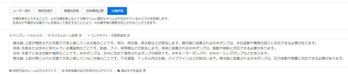 2.査読種別で「分類評価」を選択し、教師ラベルの定義文を入力します。(生成AIは、入力された定義文に従って、教師ラベルの妥当性を評価します)