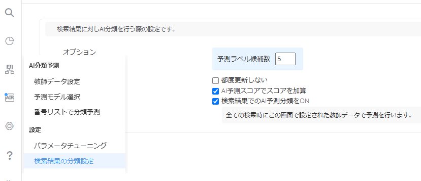 表示されていない場合、作業グループが正しく設定されているかどうか、AI分類予測の「検索結果の分類設定」で、「検索結果でのAI予測分類をON」にチェックがついているか確認してください。