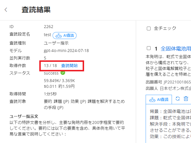 「査読結果一覧」を選択すると、査読結果画面に遷移します。「査読対象に追加」した公報の件数分だけ、取得件数の差分(13/18)があり、「査読開始」を選択すると、差分件数だけ査読を実行します。