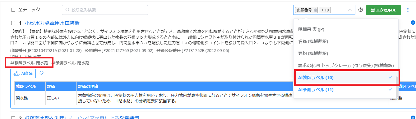 ※生成AIの出力結果で「教師ラベル」が空欄で出力されている場合は、教師ラベルが正しく読み込みされていない可能性があります。正しく読み込みされている場合は、下図のように、表示設定で「AI教師ラベル」を追加して、AI教師ラベルにラベル名が表示されているか確認してください。