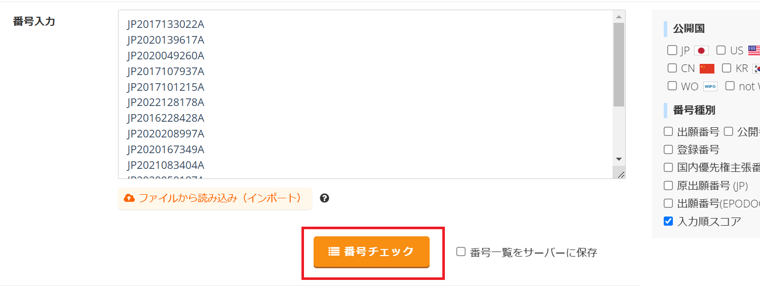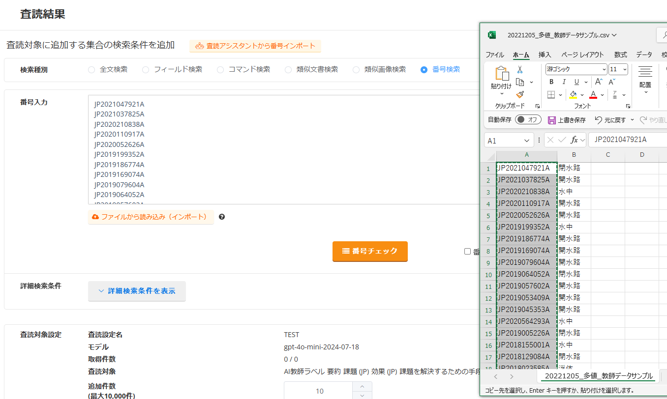 4.検索条件追加では、「番号検索」で、教師ラベルが付与されている番号リストを入力してください。分類評価では、当該公報に付与されたAI教師ラベルの妥当性を評価するため、教師ラベルが付与された番号リストを検索母集団に設定する必要があります。