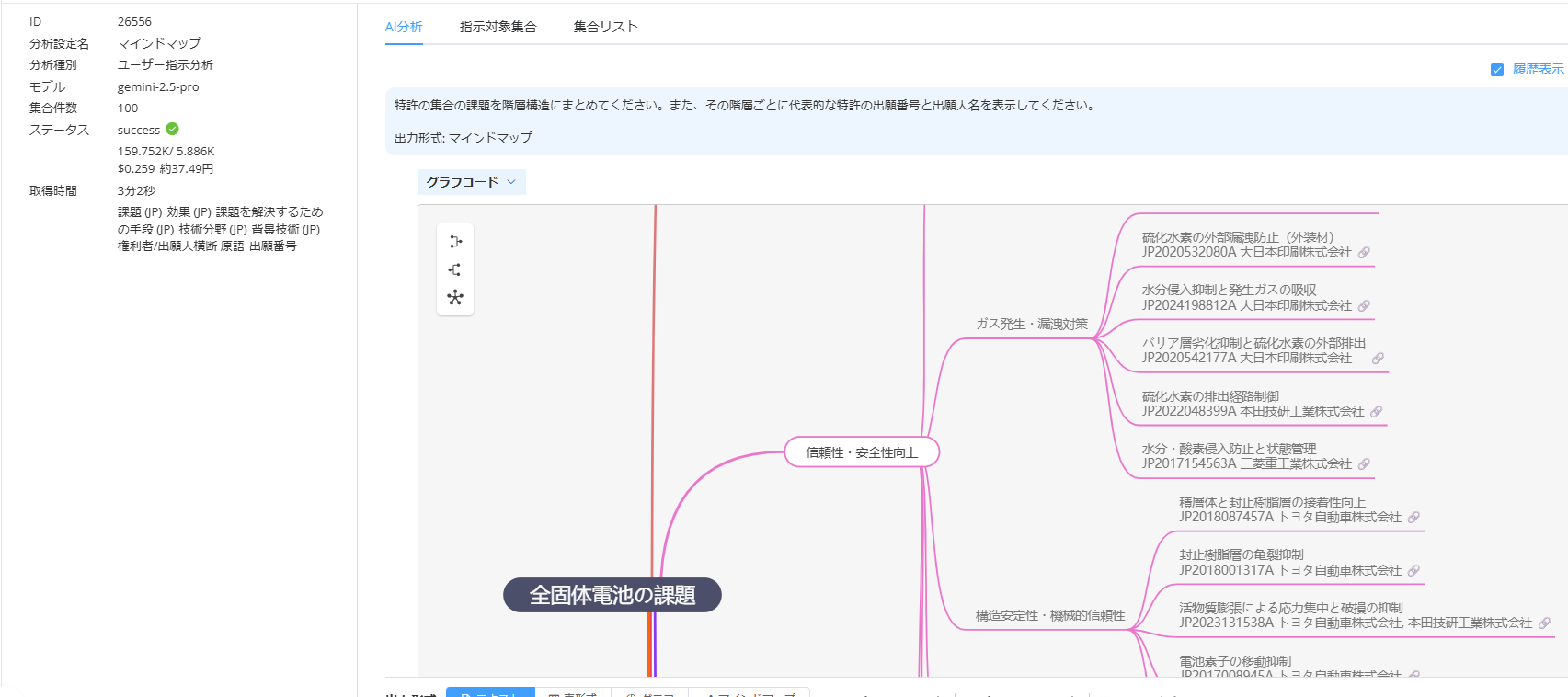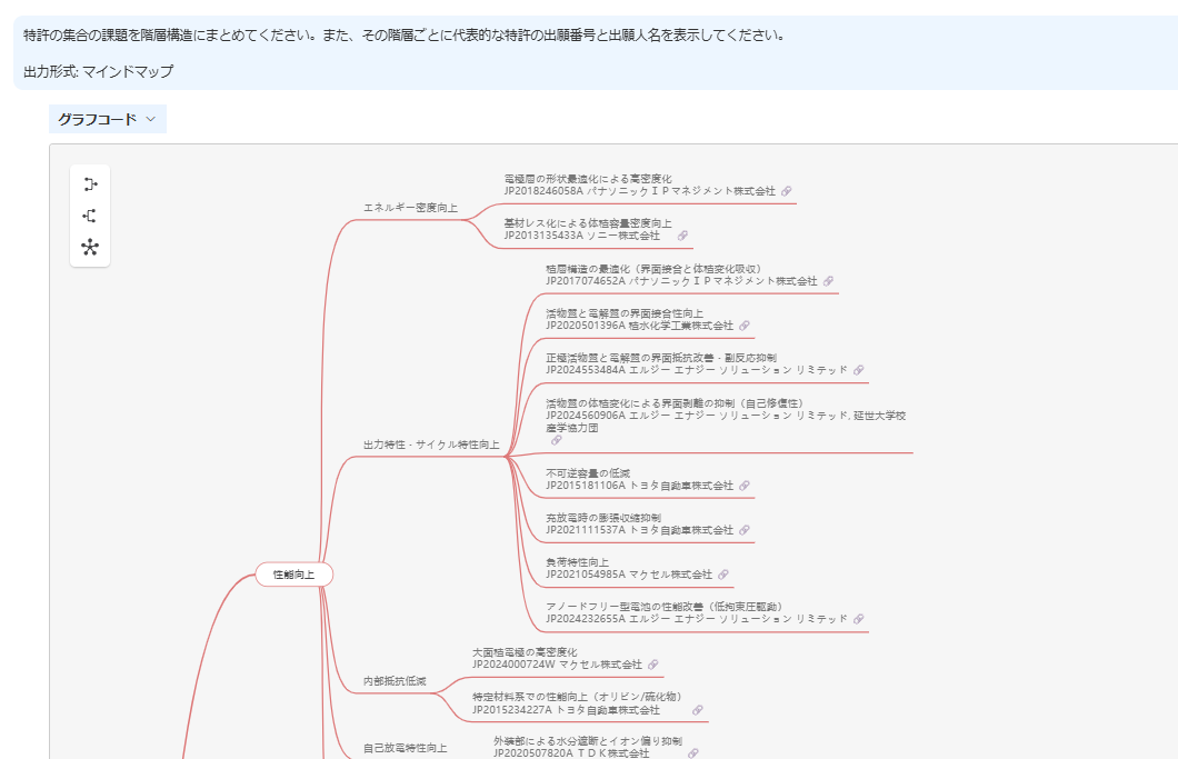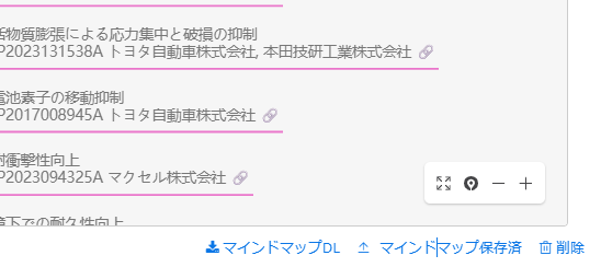 査読対象の設定で、「出願番号」を選択していると、指示文によっては、マインドマップ上に該当出願の公報リンク付きで出願番号を出力させることもできます。