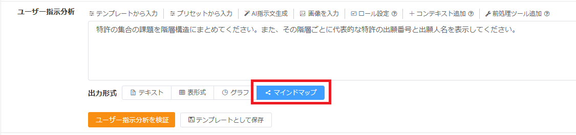 分析設定(β版)の査読設定画面の「出力形式」で「マインドマップ」を選択します。
