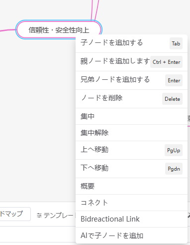 マインドマップ上に表示されている各ノードを右クリックすることで、ノードの追加や削除等の操作ができます。