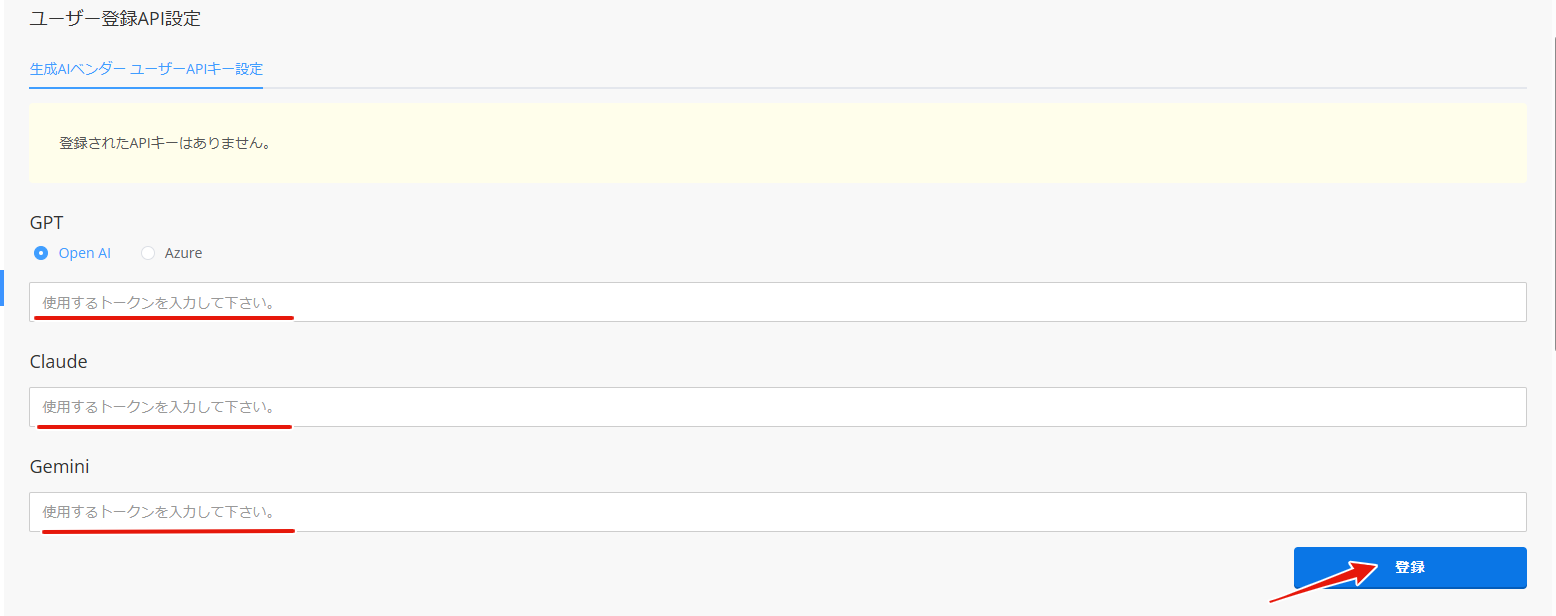 Patentfield AIRのユーザーキープランでは、ユーザーが契約している生成AIのAPIトークンを設定する必要があります。