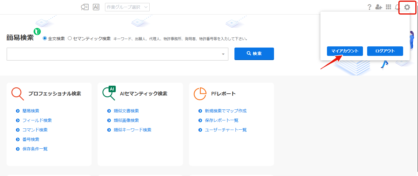 ① 画面右上の歯車マークから「マイアカウント」を開いてください