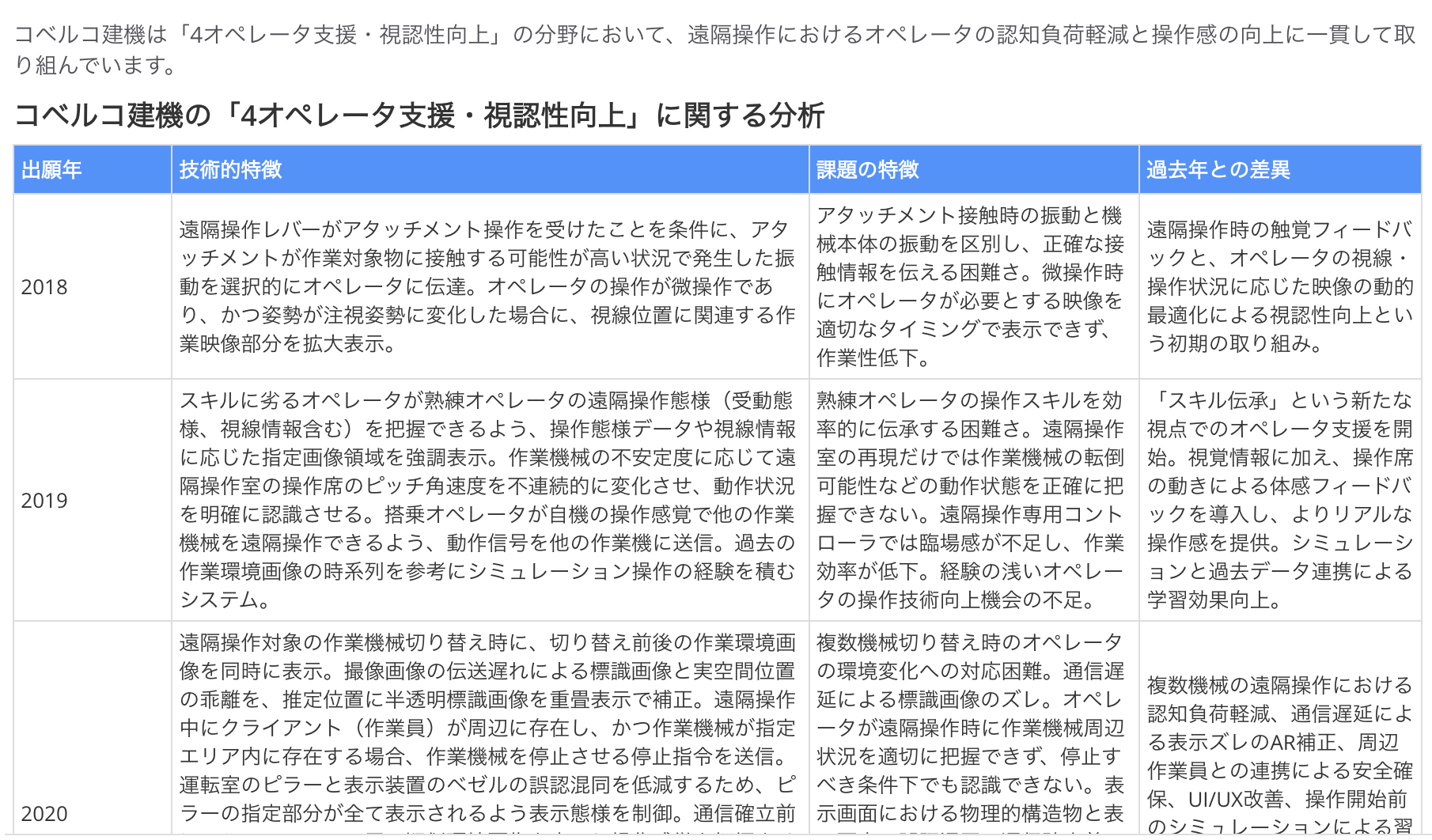「4オペレータ支援・視認性向上」についてコベルコ建機株式会社の特徴を以下の点で解析してください・出願年ごとの出願の技術的特徴、課題の特徴