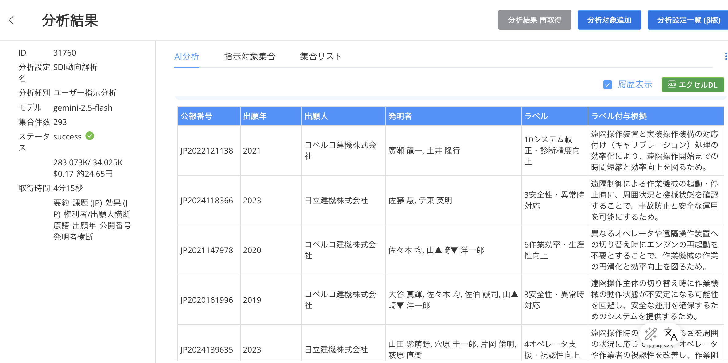 結果は、公報番号、出願年、出願人、発明者、ラベル、ラベル付与根拠の列を含む形式で出力すること。