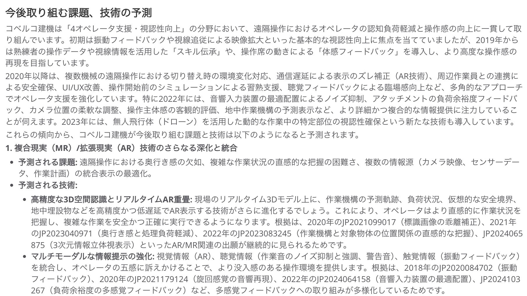 結果に基づき、今後、コベルコ建機株式会社が取り組む課題、技術の予測を提示してください。