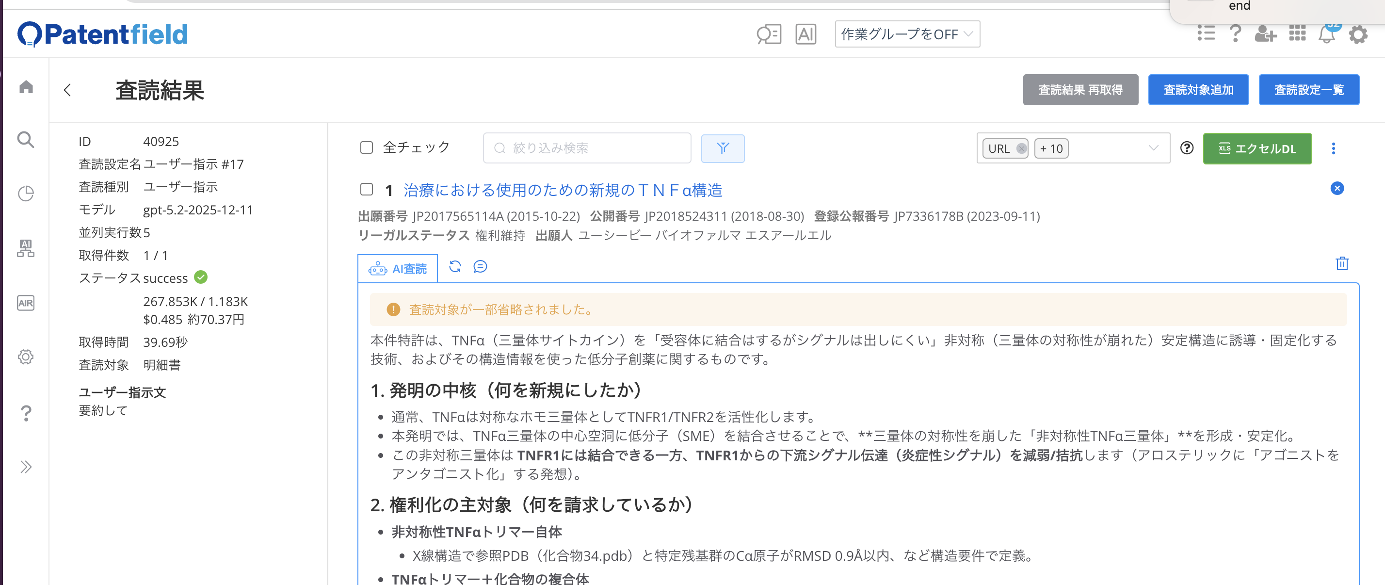 分析設定では、最大1万件の公報を処理することができます。処理件数を減らすことで、トークン数オーバーを防ぐことができます。