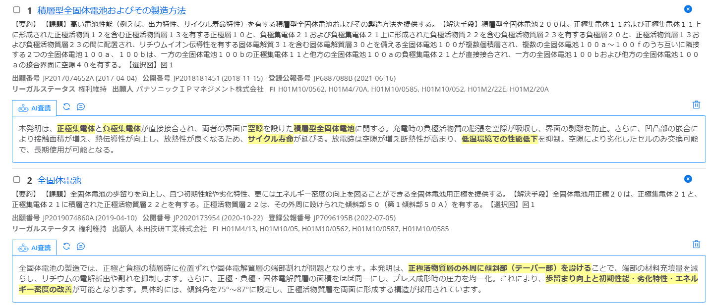 Patentfield AIRでは、生成AIの査読結果のテキストのキーワードに対して、「ハイライト」をつけて出力することができます。