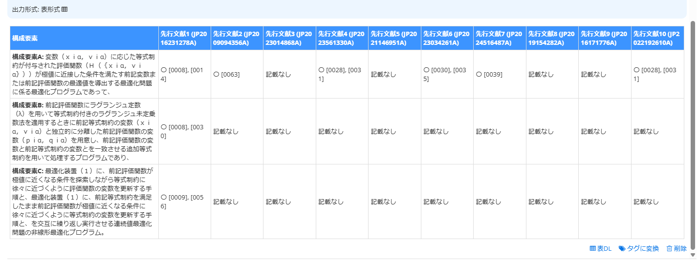 | [構成要素A] | [判断結果 + 段落番号 or ×] | [判断結果 + 段落番号 or ×] |
