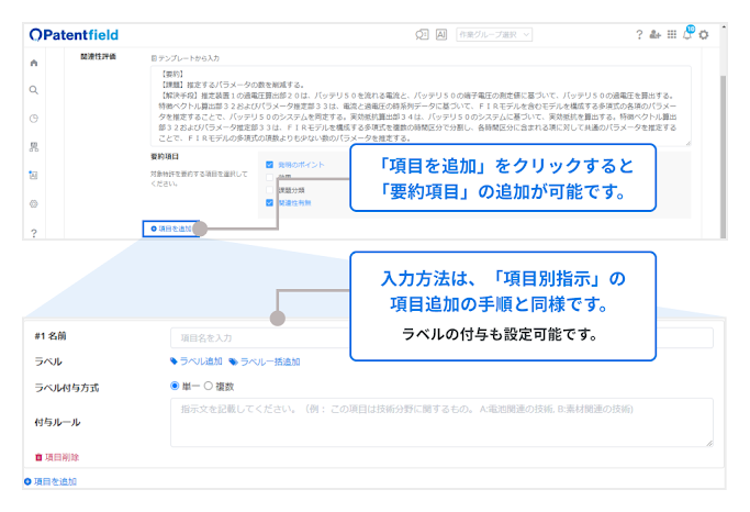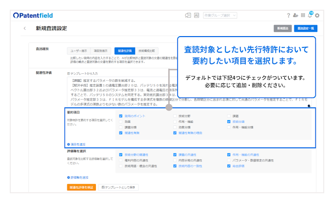 次に、査読対象とする先行特許において、要約したい「要約項目」を選択します。
