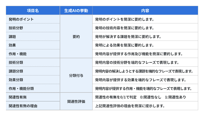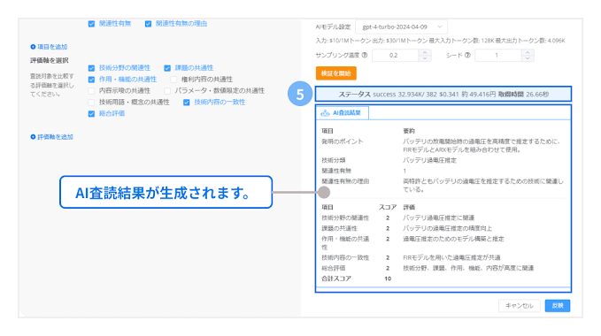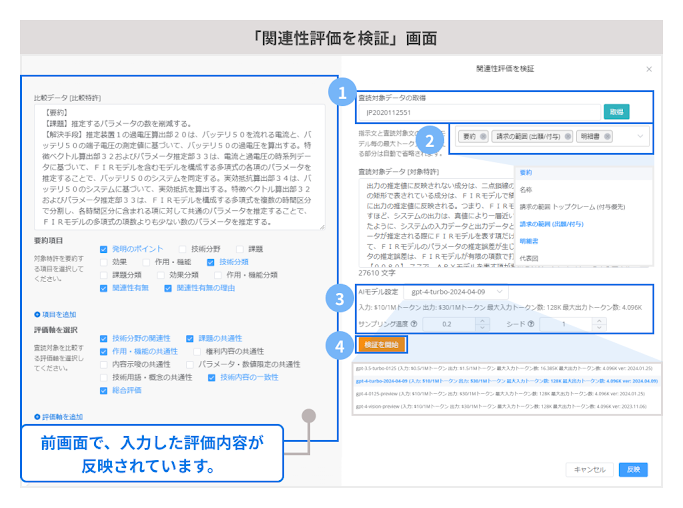 比較したい発明の内容を入力し、評価の観点と査読対象文書の要約項目を選択するだけで、入力した比較特許と査読対象文書との関連性について、選択した複数の観点において、AIに数値で評価させることができます。