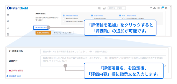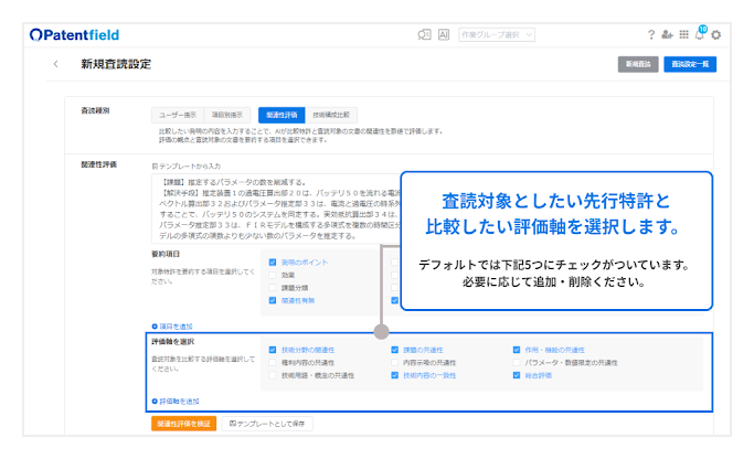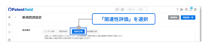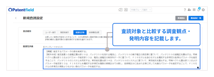 「関連性評価」を選択したら、「関連性評価」欄に表示されるテキストボックスに、査読対象と比較したい調査観点や発明内容を入力します。