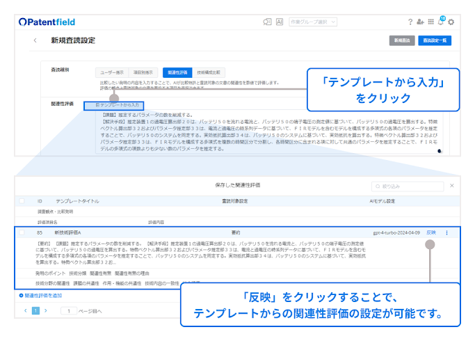 「テンプレートから入力」を選択すると、事前に作成し、保存しておいたテンプレートが選択可能で、これらを利用・編集した関連性評価内容の入力が可能です。