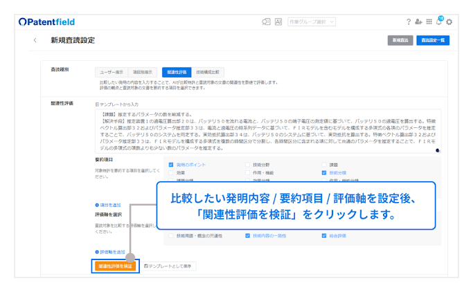 関連性評価は、比較したい発明の内容を入力することで、AIが比較特許と査読対象の文書の関連性を数値で評価します。