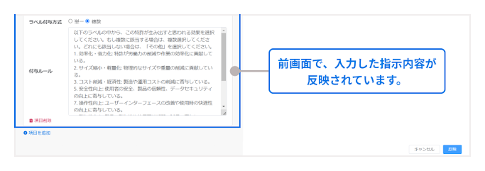 ②ラベル:「項目別指示」では、AI査読結果において、任意に設定したラベルを自動付与させることができます。