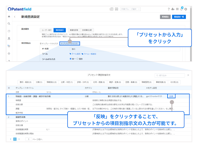 ・表示される「プリセット項目別指示文」一覧画面より、利用したい指示文の「反映」をクリックします。