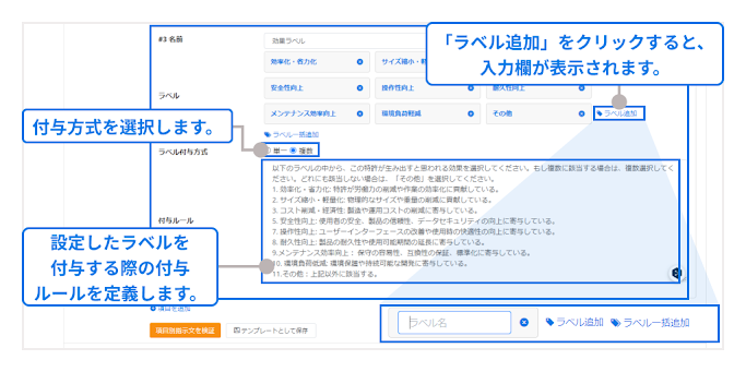 ③ラベル付与方式:上記②で設定・追加したラベルのうち、1つだけ付与させるのか、または複数付与を可能とするのかを設定します。