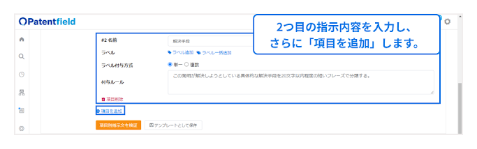 上記1つ目の項目設定が完了したら、「項目を追加」をクリックし、2つ目の指示を設定するための指示欄を新たに追加します。
