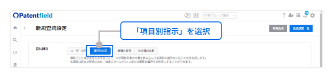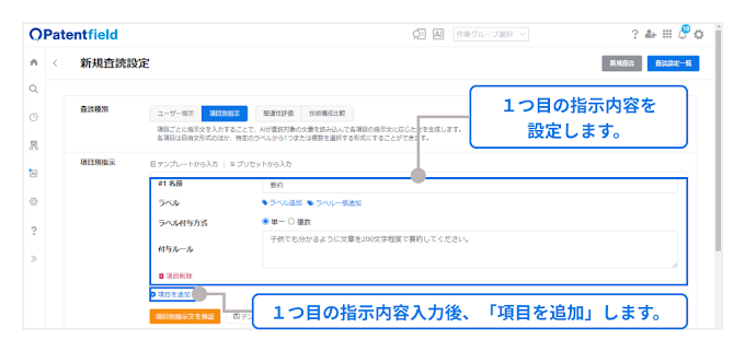 項目別指示は、項目ごとに指示文を入力することで、複数の観点に対して同時に各項目の文を生成します。