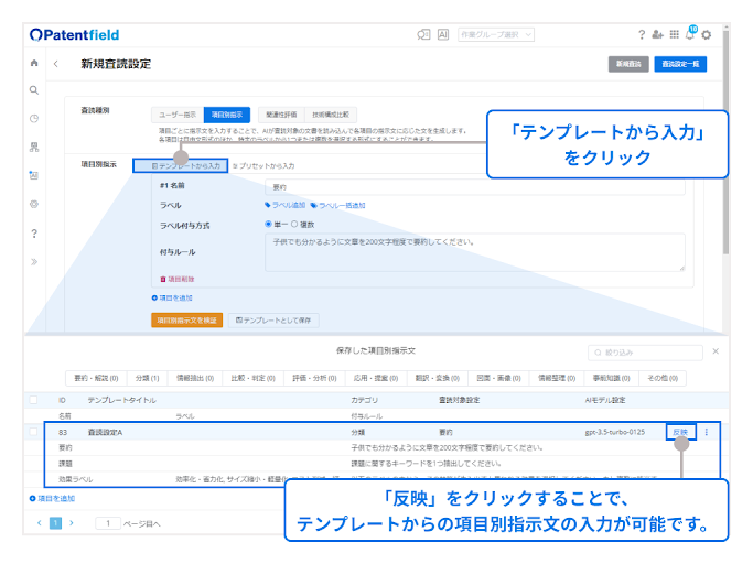 ・表示される「保存した項目別指示文」一覧画面より、利用したい指示文の「反映」をクリックします。