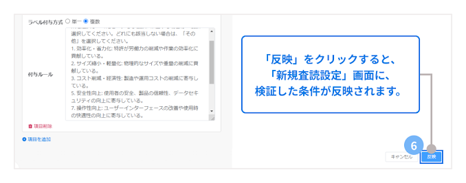 検証結果に問題がなければ、最後に⑥「反映」をクリックすることで、「新規査読設定」画面に戻ります。