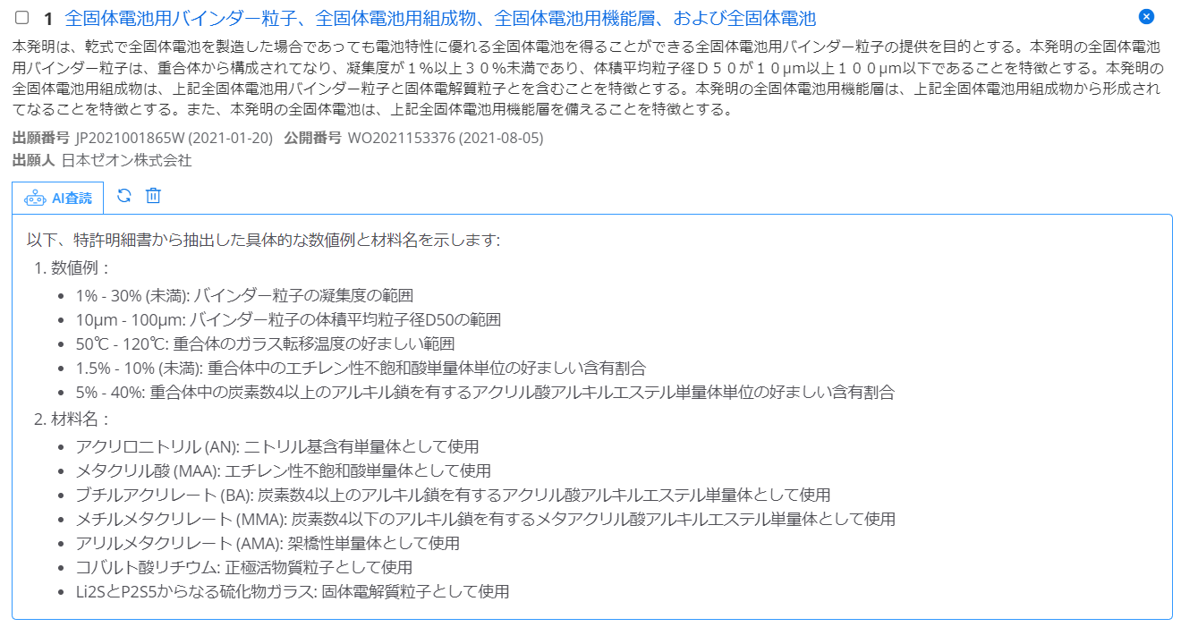 特許公報から数値例や材料名を抽出することで、特許技術で使用される材料や組成などの実施条件や性能を具体的に把握でき、技術内容をより深く理解し、実現可能性や課題を評価できます。