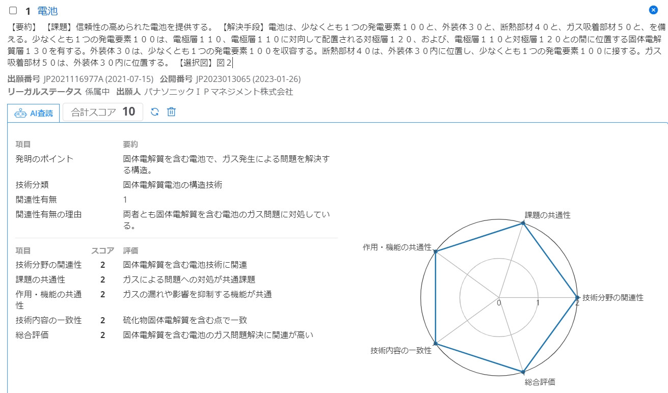 査読種別「関連性評価」では、予め設定された指示文を利用して、発明やアイデアの内容を入力することで、生成AIが入力した内容と、先行文献の関連性を数値で評価してくれます。これにより、大量の検索結果の中から関連性の高い読むべき特許を生成AIが評価してくれることで、効率的に査読をすることができます。