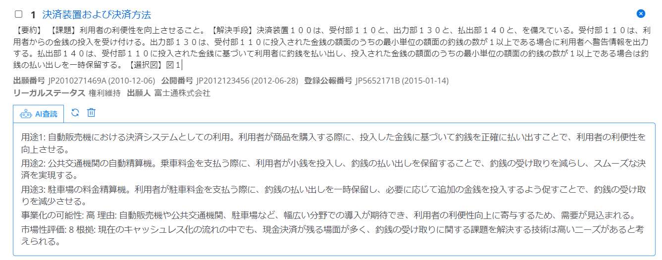 特許公報の「要約」では把握できない内容や、特許文書に馴染みのない人でも読みやすい平素な文章で公報内容を独自に要約することができます。