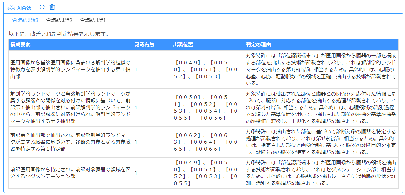 比較したい請求項の内容を入力することで、請求項の各構成要素が査読対象の文書に記載されているかを判定します。各構成要素が文書中のどの段落に記載されているかについても判定することができ、出願前調査や無効調査のシーンにおいて、特許性の判断においてリスクとなる文献を効率的に評価できます。