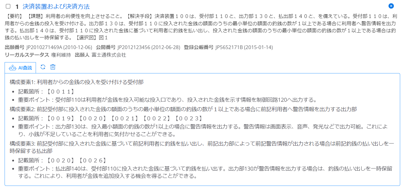 特許請求の範囲は抽象的な表現で記載されていることが多く、技術的内容を理解できないことがあります。特許請求の範囲の構成要素ごとに明細書の対応箇所の抽出し、重要ポイントを解説させることで、特許請求の範囲の内容をより理解しやすくなります。