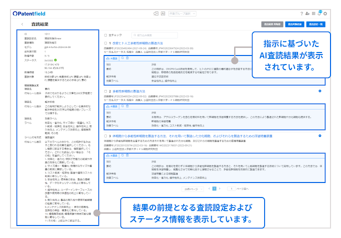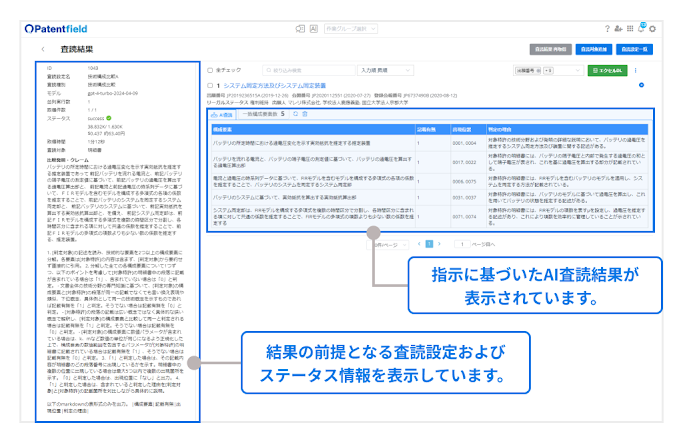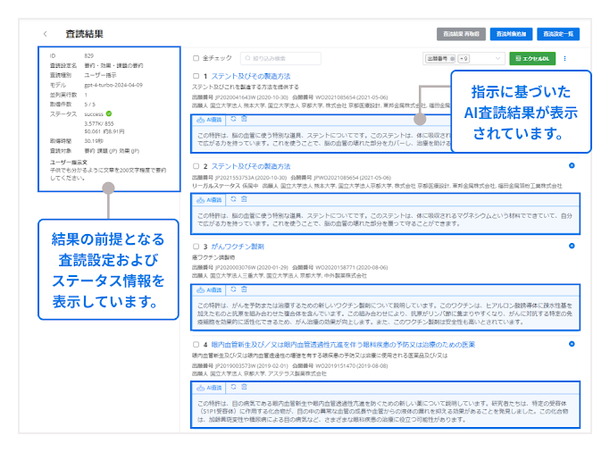 STEP2で「査読開始」をクリックすると、作成した査読条件に基づいた生成AIによる査読が実行され、査読結果画面が表示されます。